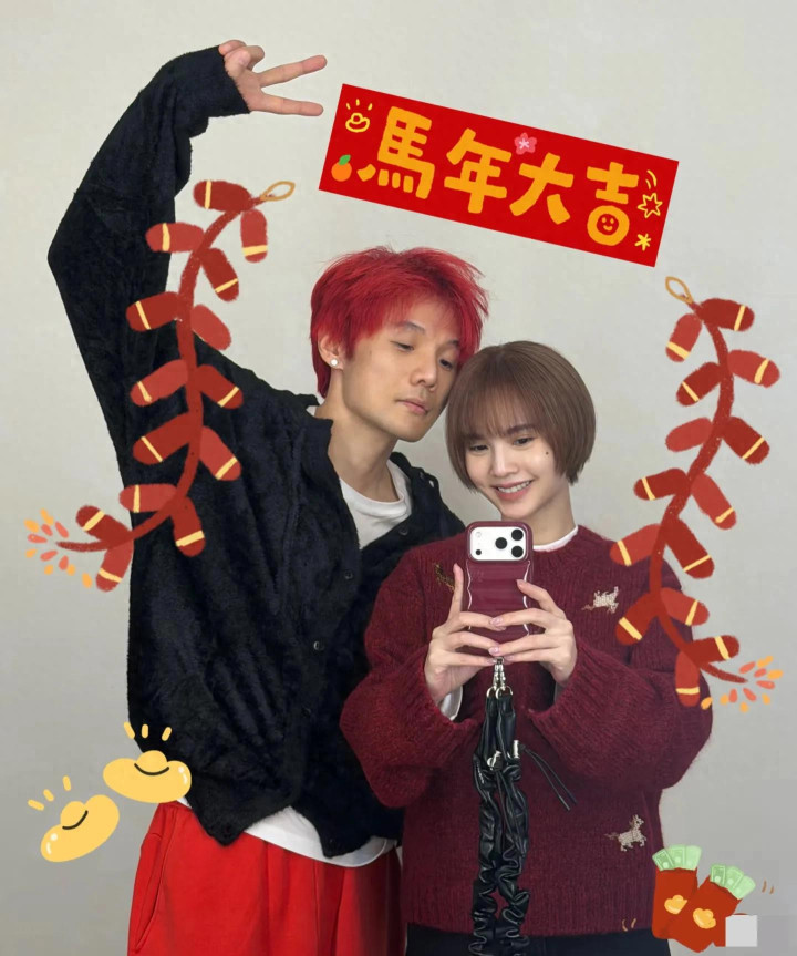 杨丞琳穿戴酒红色的毛衣,一头短发甜好意思可人,傍边大李荣浩身穿玄色上衣,搭配红色裤子,一头红发对着镜头高举手比耶。他们对镜自拍,还给图片加上了马年大吉,以及各式可人的小贴纸。
