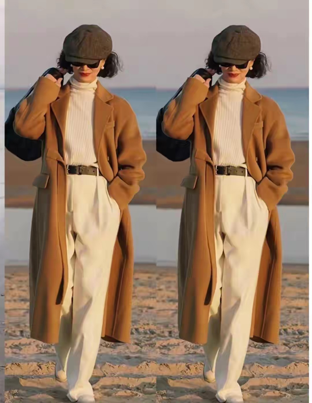 苟简的穿搭,反而能让你变得更清翠,举例用一件相比有质感,有垂坠感的驼色大衣外衣,内搭半高领的白色古道上衣和一条白色的西装,裤脚上穿的一对白色的皮鞋,外出旅游拍照实足出片,况且气场全开。