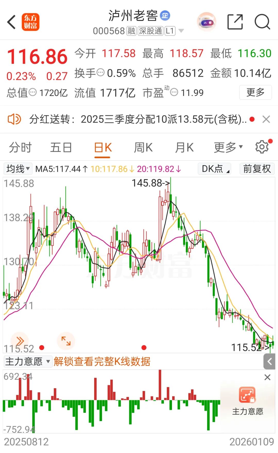 戒指1月9日体育游戏app平台,泸州老窖报116.86元/股,飞腾0.23%,总市值为1720亿元,退换股息率为5.36%。