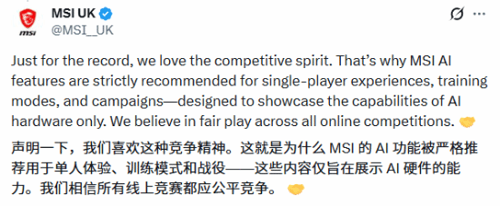 微星英国官方账号恢复此事,默示微星的 AI 功能仅严格保举用于单东说念主游戏、考验景色与战争景色,其想象初志是展示 AI 硬件的工夫技艺,而非用于线上竞技。微星明确默示 “坚信通盘线上竞技齐应撤职公正原则”,强调此类 AI 功能仅用于硬件技艺展示,退却在细密线上对战中使用。