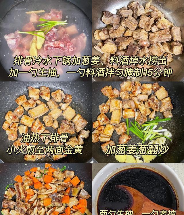 4.起锅烧油,油热后下排骨,煎至排骨两面金黄,然后放入葱姜蒜翻炒出香味,接着将胡萝卜和干香菇片倒入锅中,不绝翻炒2分钟掌握;