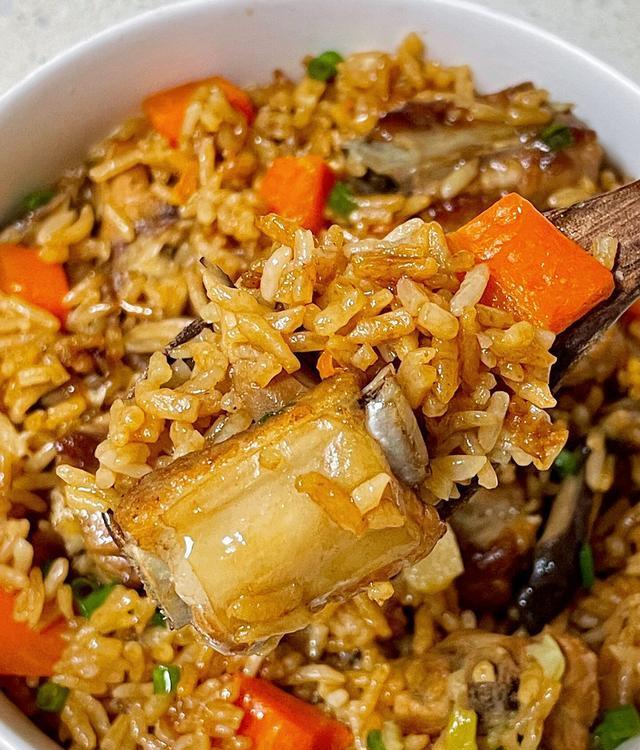 6.大米淘洗干净倒入电饭锅中,然后倒入炒好的配菜,加水刚好没过食材就行,不要放太多,终末倒入调好的料汁,按下烧饭键煮熟,出锅前撒点葱花,统共食材翻拌均匀即可(心爱香油的出锅前不错滴两滴)。
