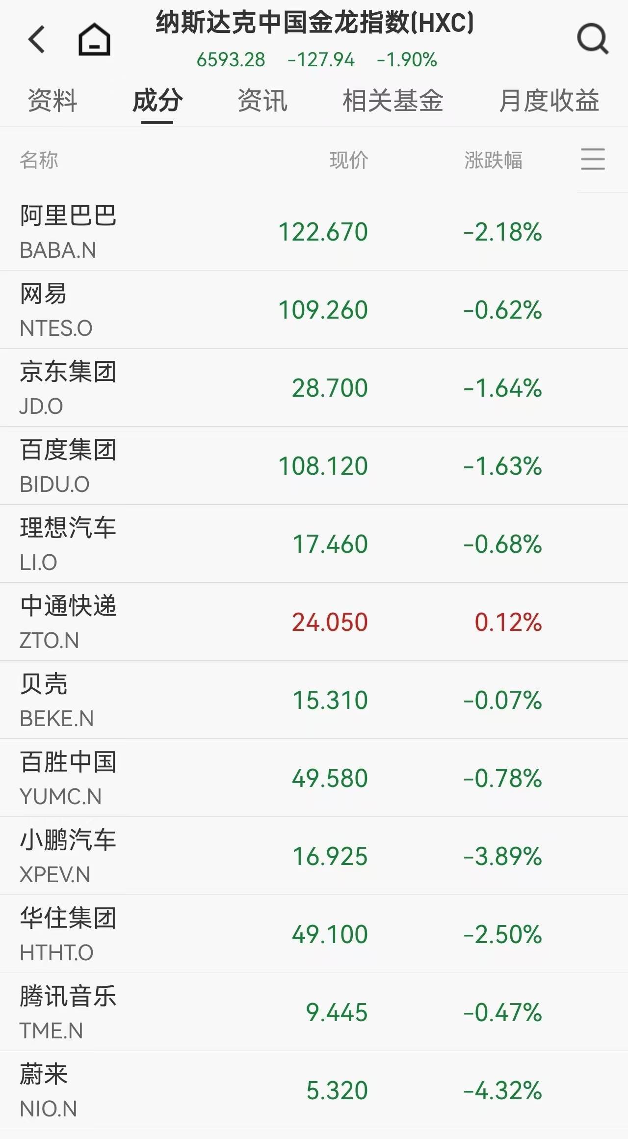 热点中概股通常未能避免,多半随大盘下行。纳斯达克中国金龙指数当日收跌1.9%,其中蔚来跌超4%,小鹏汽车、霸王茶姬、携程网、爱奇艺跌超3%,阿里巴巴、京东、百度等龙头方向也均有不同进度着落。